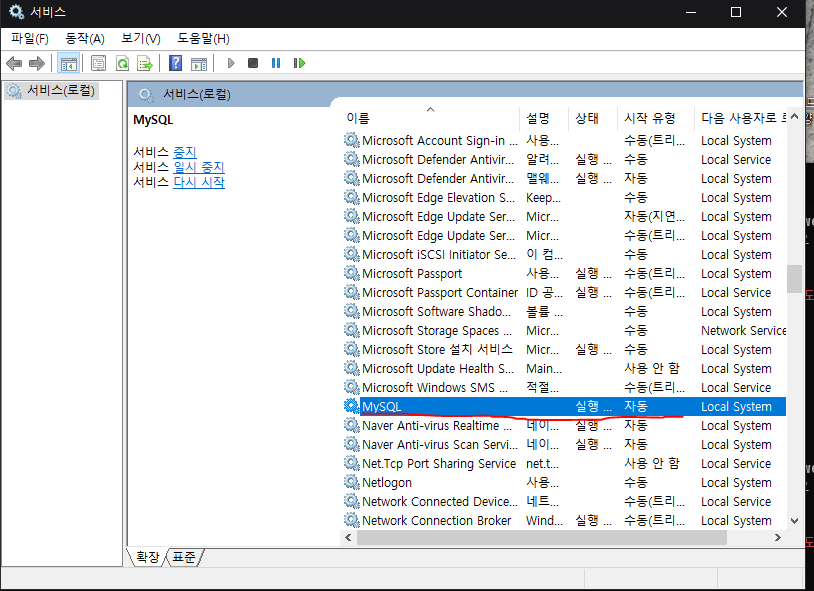 윈도우 + R 키를 누른 후 services.msc 입력하여 MySQL를 찾아 실행시켜줍니다.