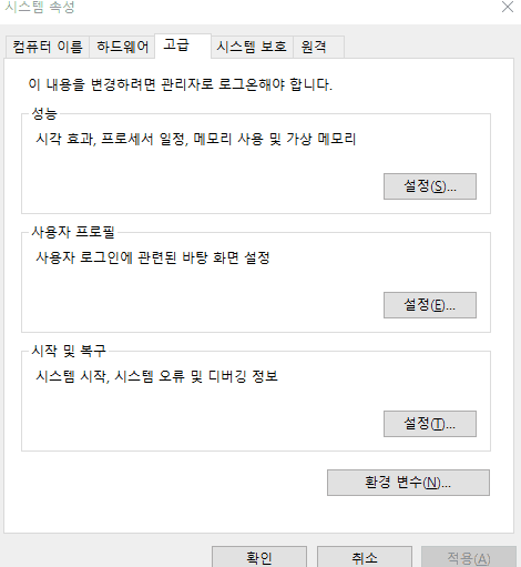 또는 탐색기 -> "내 pc"" 오른쪽 클릭 -> 속성 -> 고급 시스템 설정 -> 환경 변수