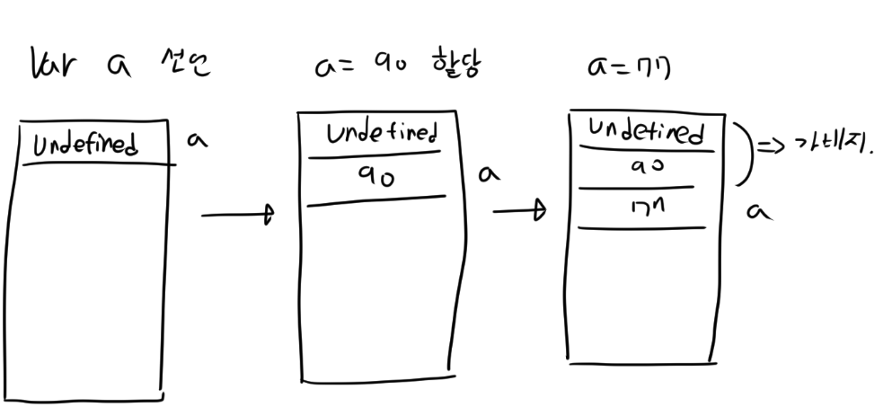 그러면 왼쪽과 같이 선언과 동시에 값을 넣어주면 되지 않냐고 생각할 수 있지만 모든 변수 선언은 undefined를 거치게 됩니다, 이유는 Js 엔진이 변수에 특정 주소를 위임하면서 값을 undefined로 초기화해주기 때문입니다.