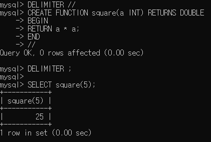 함수에서도 BEGIN, END 사이에 구분 문자인 ';' 때문에 오류가 발생하지 않도록 DELIMITER 명령어를 통해 기존 구분 문자인 ';'을 '//'으로 바꾸는 작업을 해줍니다.