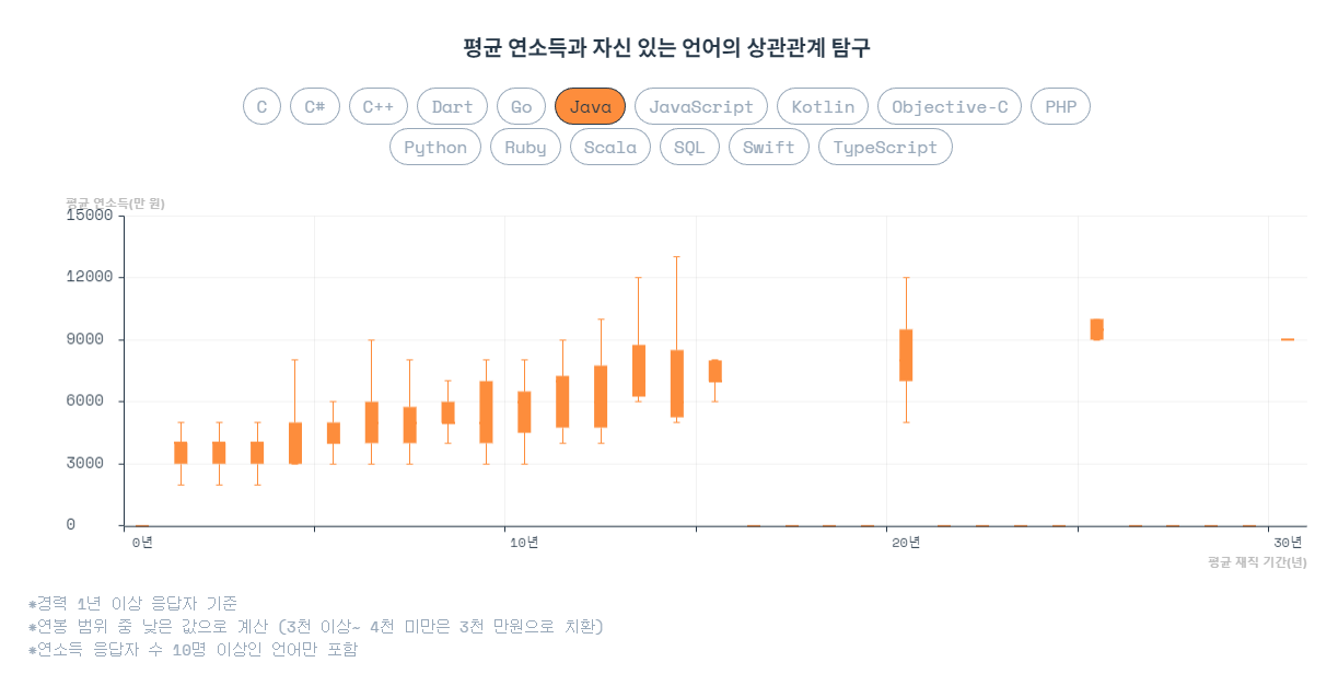 JAVA에 경우 학원에서 웹 개발자를 양성할 때 배우는 경우가 많아 공급도 많기 때문에 JAVA는 시장이 큰 만큼 공급도 많습니다.